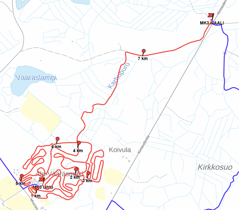 MK3 jälkeen metsäautoteitä sekä maastosiirtymää 3km sekä 0,5km asfalttitietä huoltoon /maaliin.