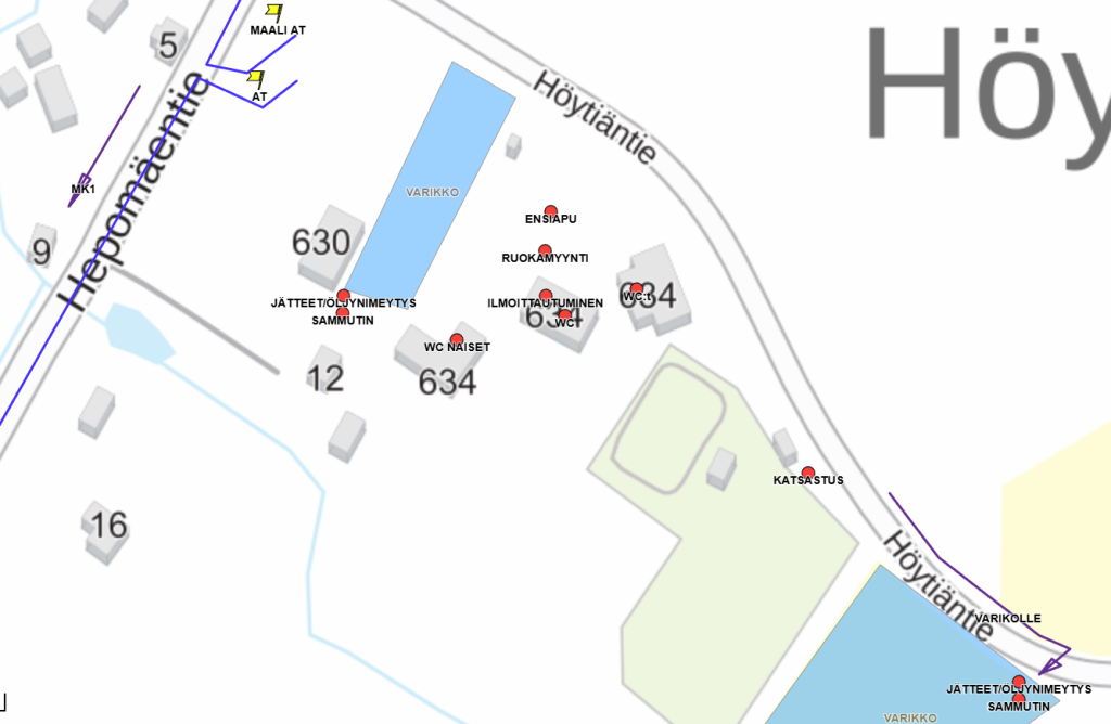 Alta löydät varikkokartan ja toimintojen sijainnit. Karttaa pääsee zoomailemaan linkistä: https://kartta.paikkatietoikkuna.fi/published/fi/4b5e0572-2b10-470c-8156-e7b581b52db1